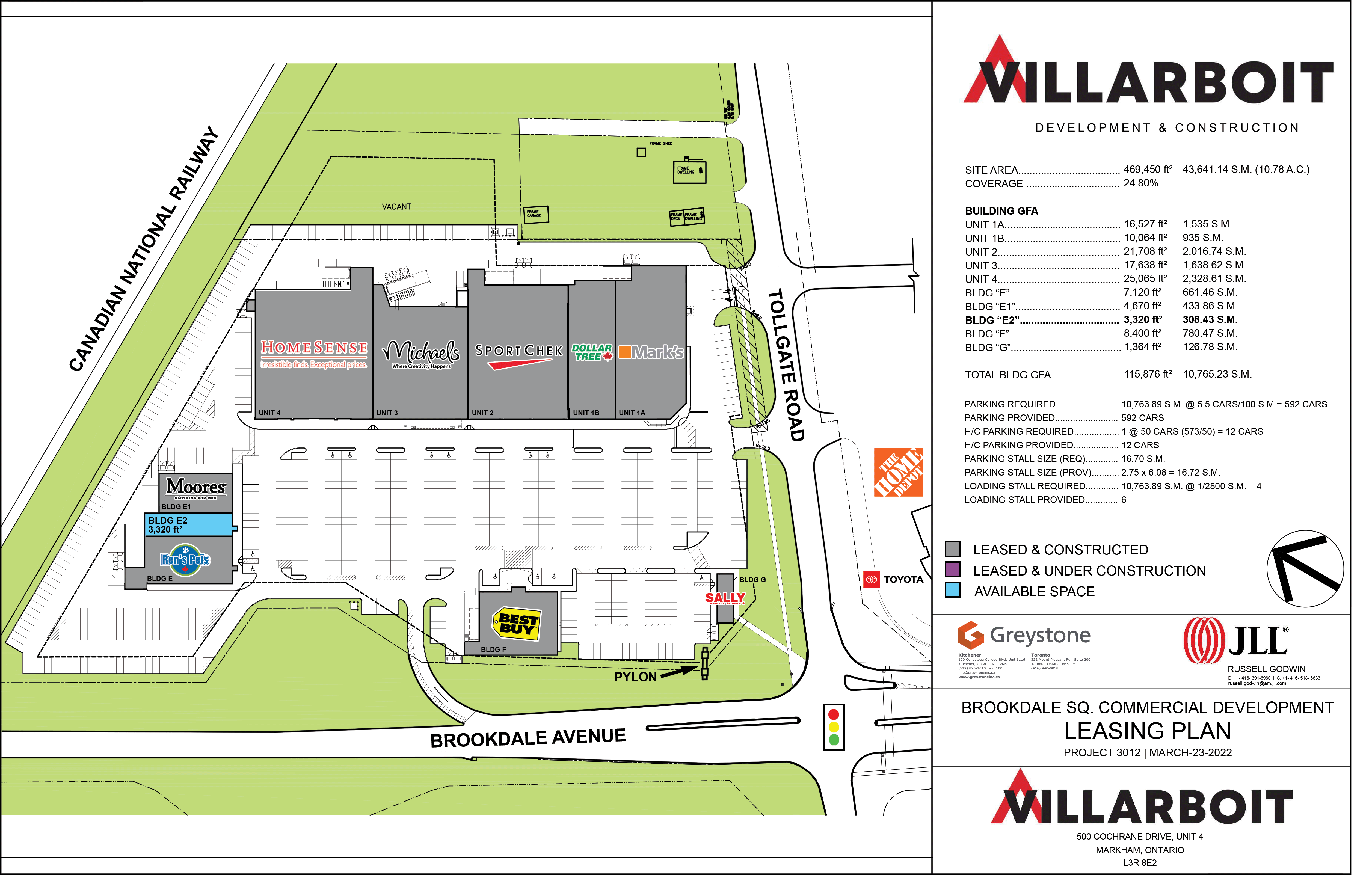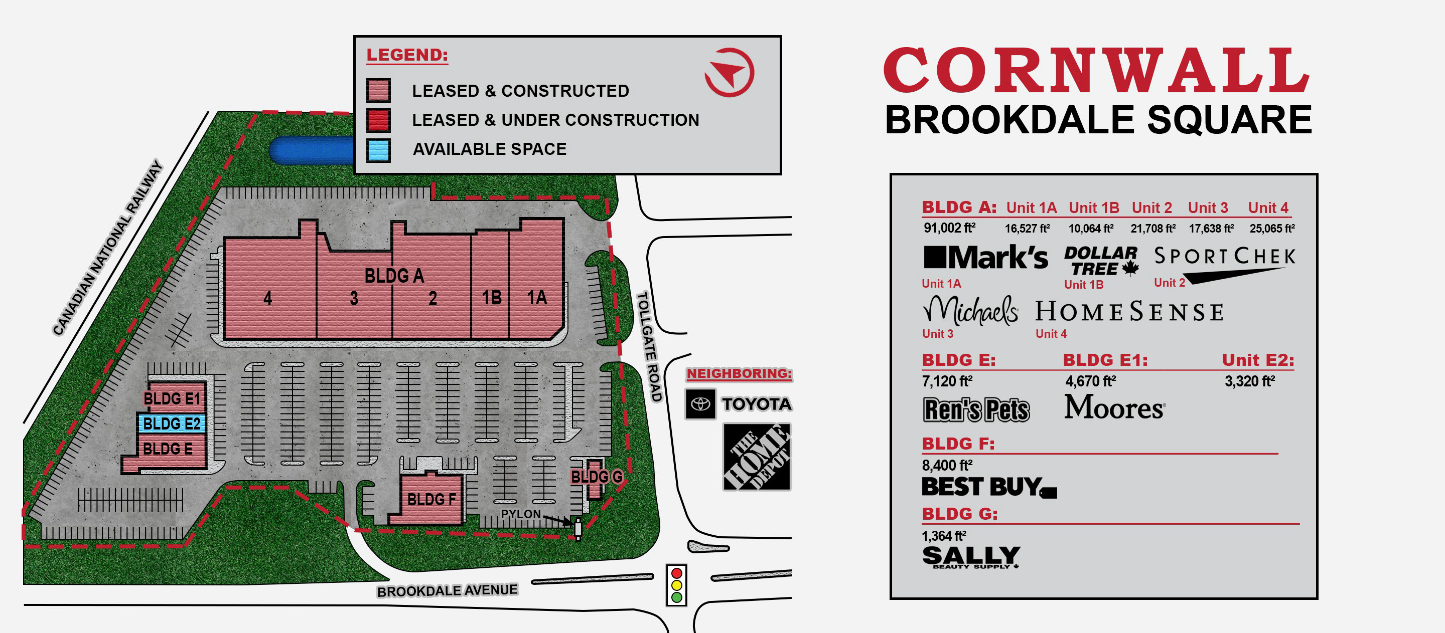 Brookdale Square Cornwall, Ontario DESCRIPTION // SITE SIZE: 116,241 SF Located directly off Hwy 401 on the primary access point throughout the City of Cornwall, with leases to major national retailers including SportChek, Best Buy, PetSmart, Dollar Tree, and Mark’s Work Warehouse. SITE PLAN // FULL VIEW OF SITE PLAN // Back To Developments